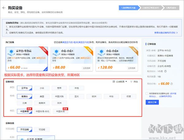 3、點擊【新購設備】進入購買頁面,選小眾或寬帶設備,地域與注冊公司所在地一致,購前閱讀須知。