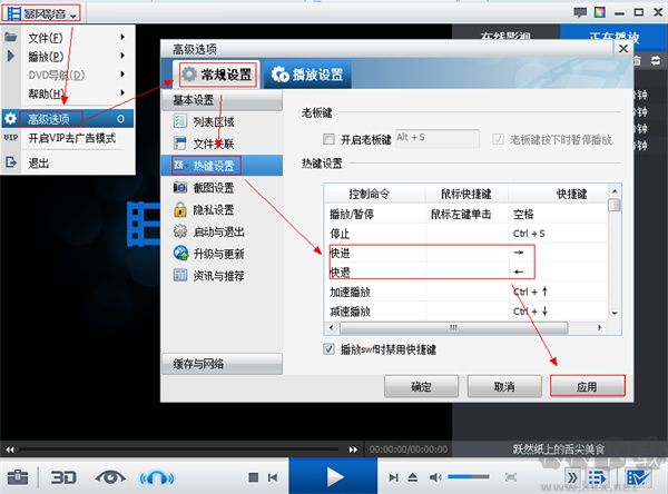 目前暴風暫時只支持本地視頻和在線暴高清視頻的快進/快退。暴風5的默認快進快退的快捷鍵為【快進 →】和【快退 ←】,可以使播放快進5秒或快退5秒。您可以進入高級選項——常規(guī)設(shè)置——熱鍵設(shè)置中設(shè)置快捷方式。