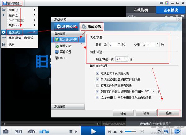 進入高級選項——播放設(shè)置——基本播放設(shè)置中設(shè)置快進/快退一次跳過時間。