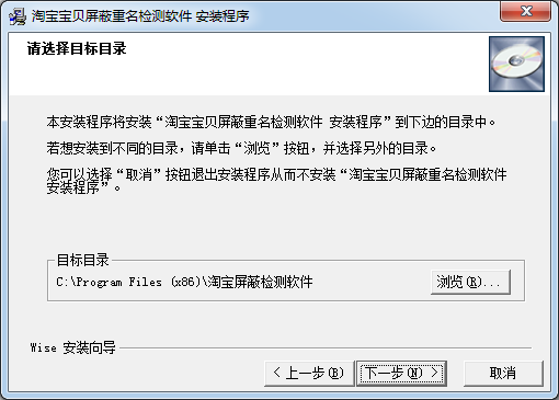 2.本安裝程序?qū)惭b“淘寶寶貝屏蔽重名檢測軟件安裝程序”到下邊的目錄中。若想安裝到不同的目錄,請單擊“瀏覽”按鈕,并選擇另外的目錄。您可以選擇“取消”按鈕退出安裝程序從而不安裝“淘寶寶貝屏蔽重名檢測軟件安裝程序