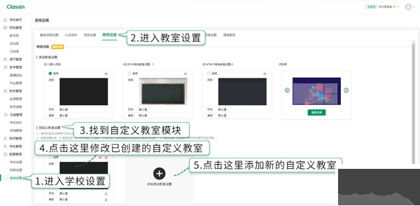 1、在ClassIn軟件中進(jìn)入系統(tǒng)設(shè)置界面,然后在教室設(shè)置里新建自定義教室或修改已創(chuàng)建好的自定義教室