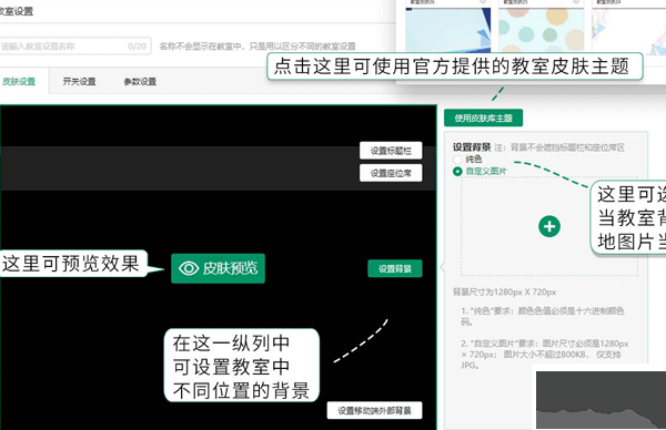 2、進(jìn)入后你可以選擇使用官方提供的教室皮膚,也可以使用純色或自定義圖片當(dāng)教室背景