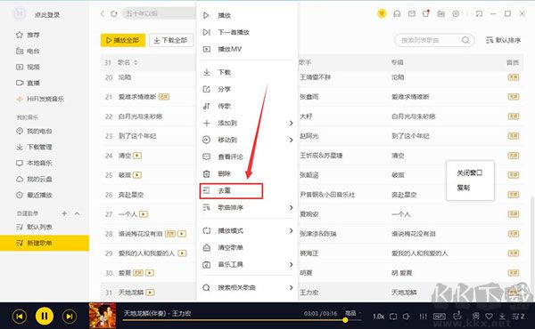 在播放列表中點擊鼠標右鍵,選擇去重功能即可。