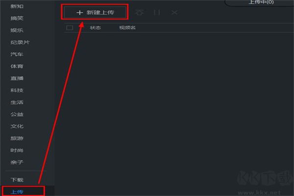 1、打開(kāi)在本站下載站好的優(yōu)酷視頻客戶端后,打開(kāi)軟件后點(diǎn)擊左側(cè)的【上傳】選項(xiàng),然后在選擇【新建上傳】。
