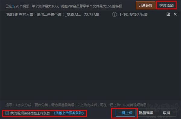 4、選擇完成后,勾選界面左下角的“我的視頻符合優(yōu)酷上傳條款”,如果您不知道優(yōu)酷上傳視頻條款,您可以點(diǎn)擊“優(yōu)酷上傳服務(wù)條款”即可。