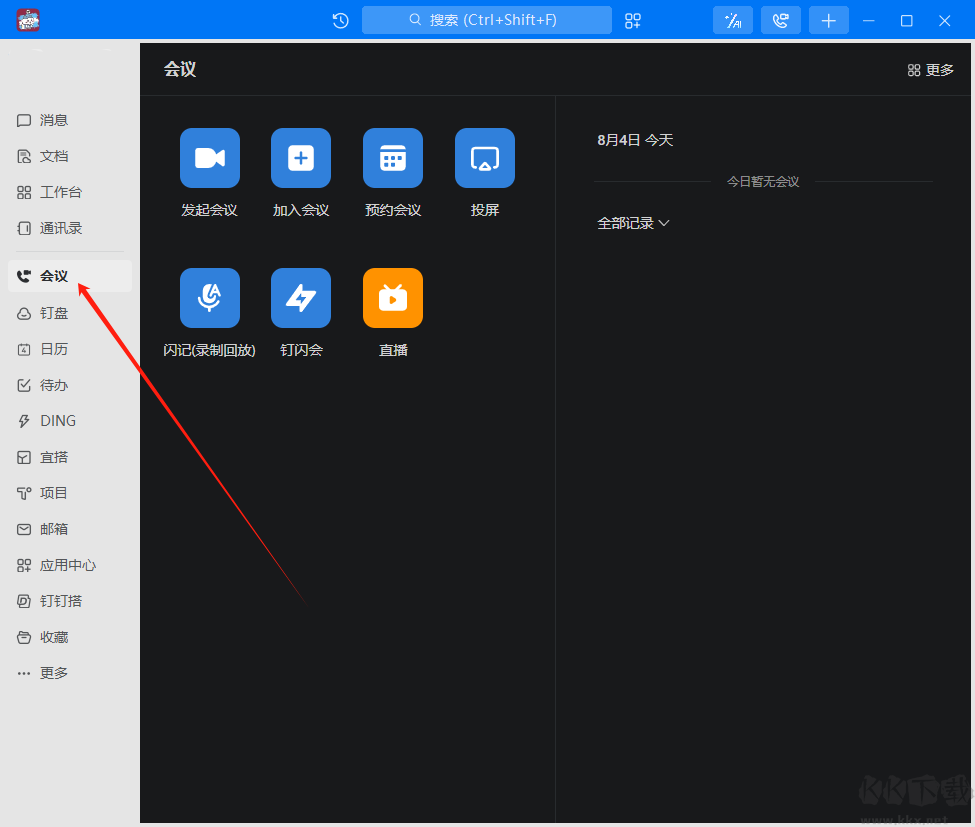 打開釘釘電腦版并登錄,單擊客戶端左側(cè)會議。進入會議頁面,點擊發(fā)起會議。