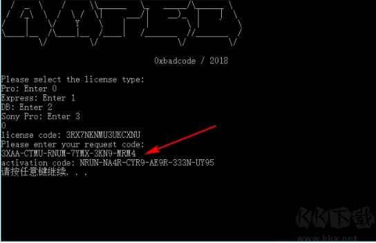 3、打開注冊(cè)機(jī),輸入序號(hào)(出現(xiàn)的三個(gè)版本,由于小編選擇的是Pro版,所以這里輸入0)回車之后就可以自動(dòng)計(jì)算出許可證,復(fù)制3RX7NKNMU3UKCXNU到軟件激活界面