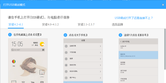 2、打開手機(jī)usb調(diào)試開關(guān),1)在手機(jī)桌面上點(diǎn)擊【設(shè)置】2)點(diǎn)擊【關(guān)于手機(jī)】3)連續(xù)7次點(diǎn)擊【版本號(hào)】