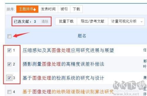 2、清除之前已選文獻(xiàn)后,單擊文獻(xiàn)之前“復(fù)選框”選擇文獻(xiàn),如圖已選中3個(gè)文獻(xiàn),還可以單擊箭頭所指“復(fù)選框”選中該頁(yè)全部文獻(xiàn)。
