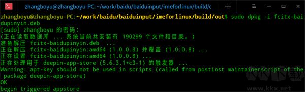 2、在終端中輸入sudo dpkg -i fcitx-baidupinyin.deb命令安裝文件;