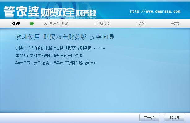 安裝向?qū)⒃谀愕碾娔X上安裝財貿(mào)雙全財務版V17. 0。