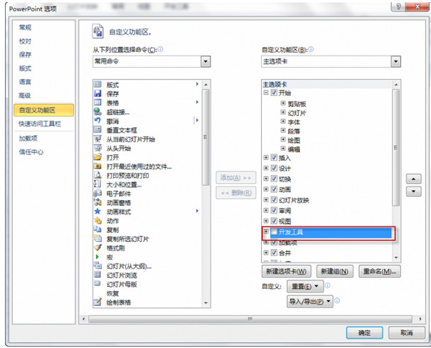 “開始”——“選項”——“自定義功能區(qū)”——勾選上“開發(fā)工具”——“確定”