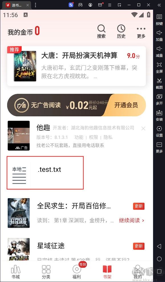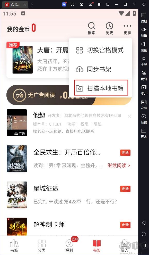 1、在本站下載追書神器電腦版后點(diǎn)擊書架;