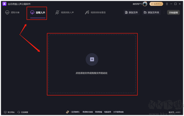 1、點(diǎn)擊“提取人聲”功能,同時(shí)點(diǎn)擊以下空白處添加歌曲文件。