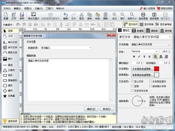 首先添加單行文字“神奇像素”,點(diǎn)擊左側(cè)“單行文字”,然后在透明水印編輯區(qū)域中任意位置點(diǎn)擊鼠標(biāo)左鍵,默認(rèn)彈出文字輸入框,輸入想要修改的文字內(nèi)容,點(diǎn)擊確定即可完成修改。如下圖所示: