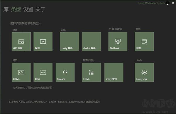 采用結(jié)構(gòu)化分類展示,明確標(biāo)注各類支持的媒體格式。用戶可直接選擇對應(yīng)分類按鈕,快速導(dǎo)入指定類型的動態(tài)壁紙內(nèi)容。