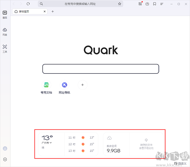 1、直接進入瀏覽器主界面,仍然比較簡潔,搜索框默認夸克搜索引擎,搜索框下面有快捷導(dǎo)航,接著下面是快捷卡片以及側(cè)邊欄,當(dāng)然這些都可以自定義,可以設(shè)置隱藏。
