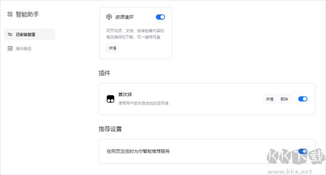 5、夸克瀏覽器自帶智能助手,也就是擴展插件功能,默認安裝了一個資源嗅探插件。
