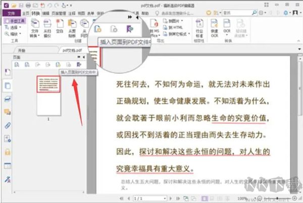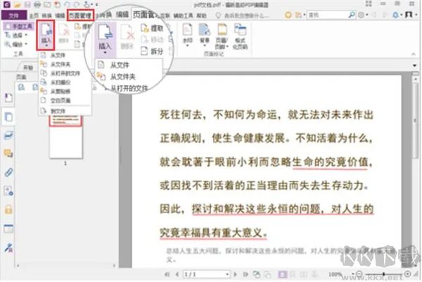 4、或者,你也可以點(diǎn)擊福昕高級(jí) PDF 編輯器菜單欄中的“頁面管理”,在其功能欄中點(diǎn)擊“插入”,再從“插入”子菜單中選擇需要合并的 PDF 并進(jìn)行排列。