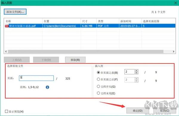 5、接下來,在福昕高級(jí) PDF 編輯器彈出來的插入頁面的設(shè)置中,用戶設(shè)置需要合并的 PDF 具體的展現(xiàn)位置,設(shè)置完成后,點(diǎn)擊“確定”按鈕。