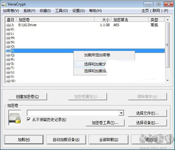 1、運(yùn)行veracrypt,在主窗口的虛擬盤符上單擊,然后右鍵點(diǎn)擊“選擇和加載文件”菜單,這里我選擇P盤符,如下圖所示: