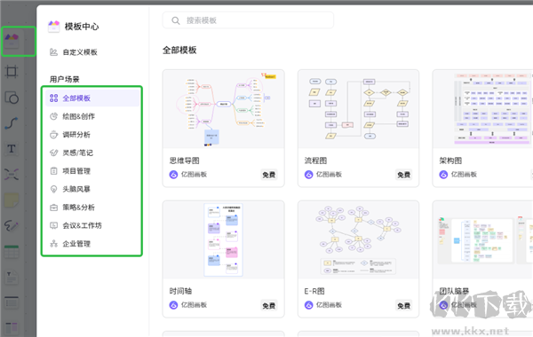 2、用戶可在畫板中點(diǎn)擊模版圖標(biāo),插入流程圖、筆記等各類模版。