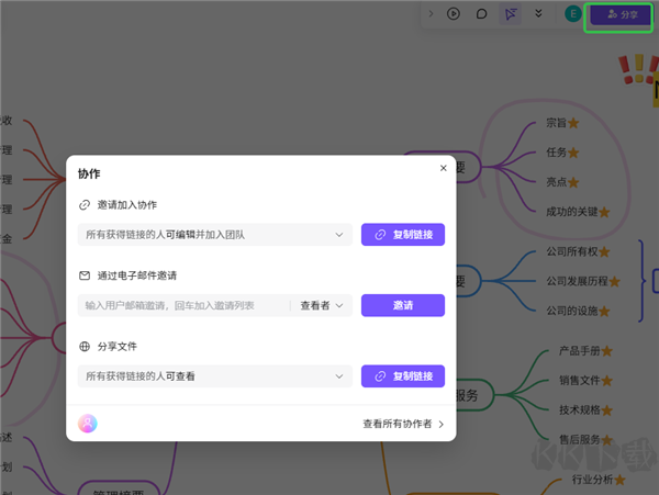4、完成畫板編輯后,點(diǎn)擊右上角分享,將連接分享給成員即可開始些協(xié)作。