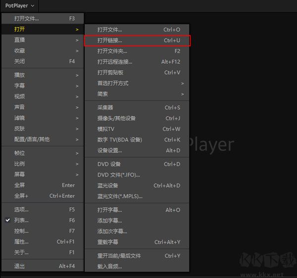 1、打開(kāi) PotPlayer,點(diǎn)擊左上角的 打開(kāi) → 打開(kāi) → 打開(kāi)鏈接。