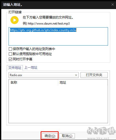 2、把直播源的地址粘貼進(jìn)去,然后點(diǎn) 確定。