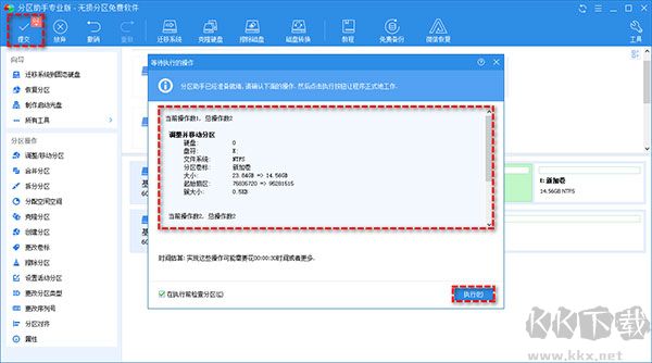 5、最后,點(diǎn)擊軟件左上角的“提交”按鈕,會(huì)顯示待執(zhí)行的操作列表,仔細(xì)檢查確認(rèn)無誤后,點(diǎn)擊“執(zhí)行”按鈕,軟件就會(huì)開始給C盤擴(kuò)容了。