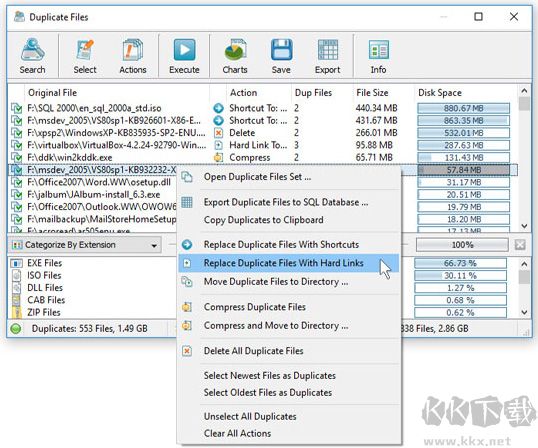 內(nèi)置的重復文件掃描功能非常強大,能在服務器、NAS 或企業(yè)存儲系統(tǒng)中精準找出重復內(nèi)容。除了生成報告和圖表外,還能直接刪除冗余文件,或用硬鏈接替換,甚至壓縮后移動到指定位置,節(jié)省存儲空間。