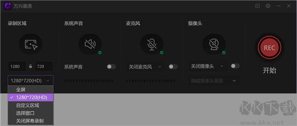 3、區(qū)域設(shè)定完成后,可以設(shè)置系統(tǒng)聲音、麥克風(fēng)和攝像頭。全部設(shè)置完成后,可以單擊“REC”紅色按鈕開始錄制。