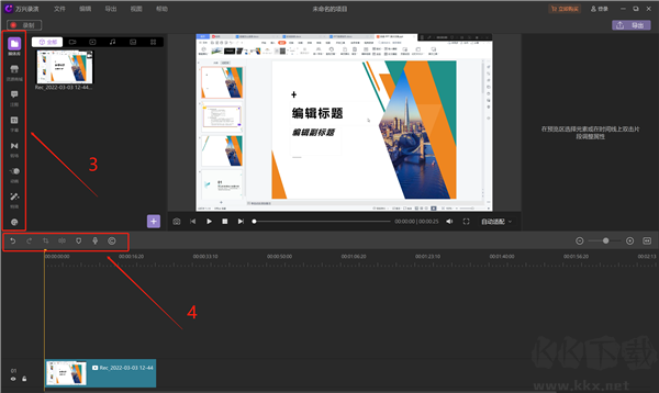 5、完成錄制后,視頻會直接導(dǎo)入剪輯界面??梢栽?ldquo;3”的紅框中添加注釋、字幕、轉(zhuǎn)場、動畫、貼紙等特效。可以在“4”的紅框中對視頻進(jìn)行剪裁、切割、添加標(biāo)記和錄音等操作。