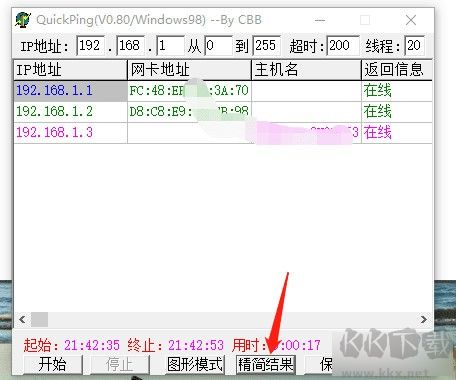 2、選擇要ping的IP段 直接點(diǎn)開始,速度非常快,幾秒后得到下圖結(jié)果