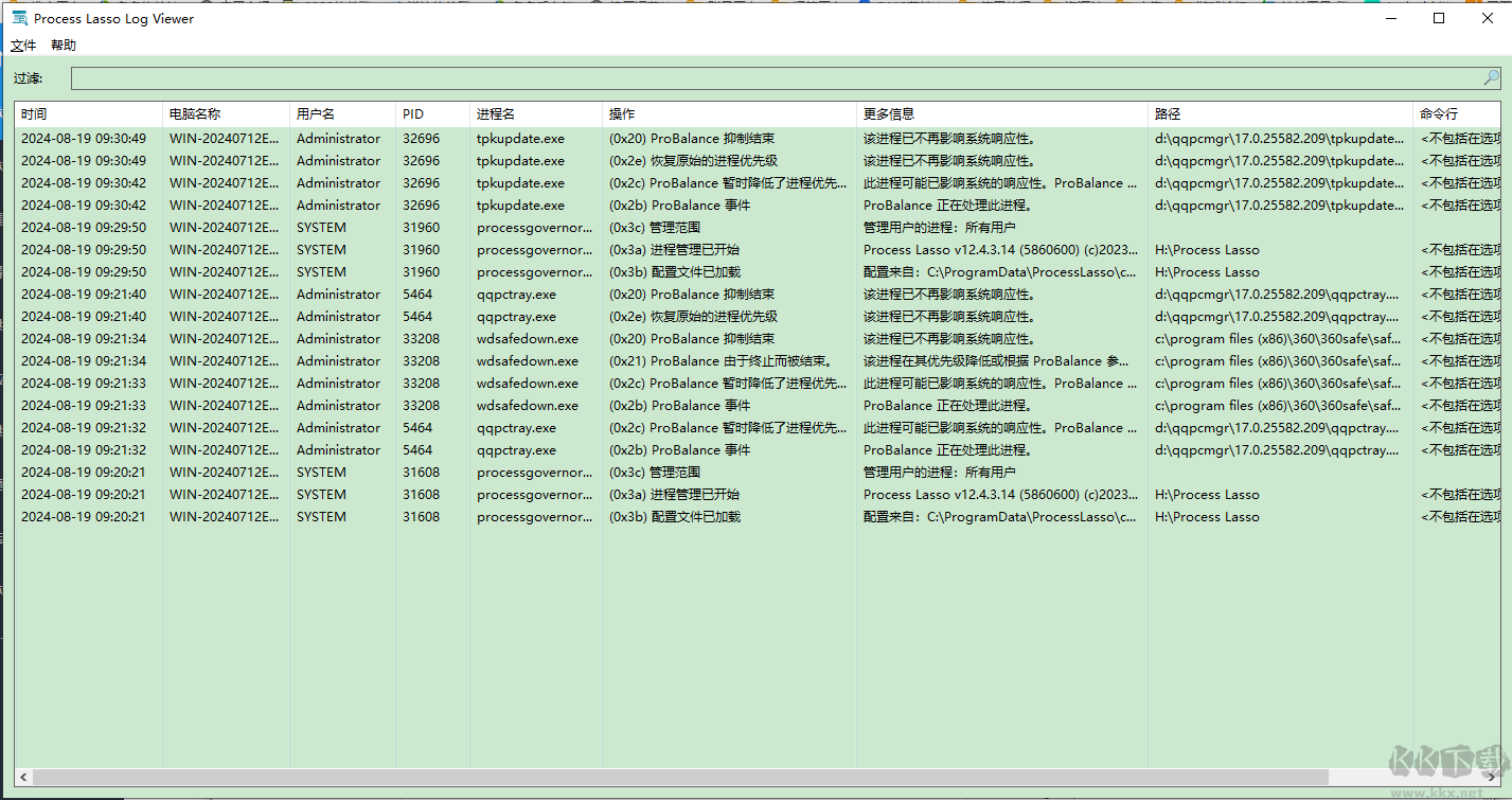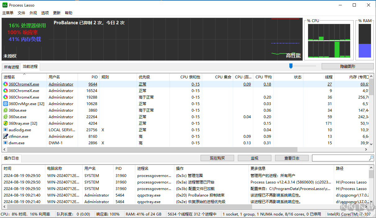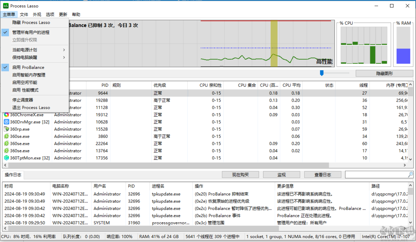 ProcessLasso 是一款高效的系統(tǒng)優(yōu)化工具,主要用于管理計(jì)算機(jī)運(yùn)行中的各項(xiàng)任務(wù),智能調(diào)節(jié)進(jìn)程優(yōu)先級(jí),平衡資源分配,避免系統(tǒng)卡頓,自動(dòng)識(shí)別高負(fù)載程序,動(dòng)態(tài)調(diào)整CPU占用,保持設(shè)備流暢運(yùn)轉(zhuǎn),特別適合長(zhǎng)時(shí)間開機(jī)或需要多任務(wù)處理的環(huán)境,提升響應(yīng)速度與穩(wěn)定性。