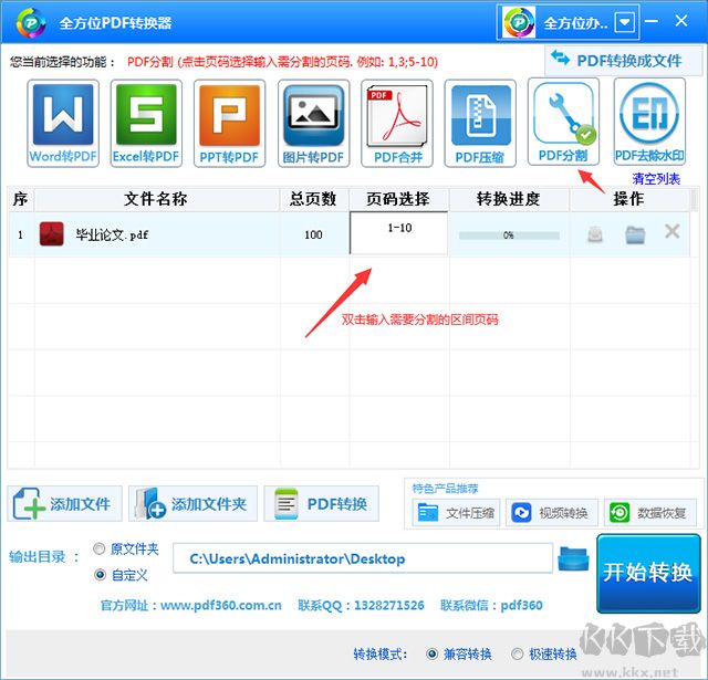 8、PDF拆分功能(按頁碼輸入指定范圍,如:1,3;5-10)。