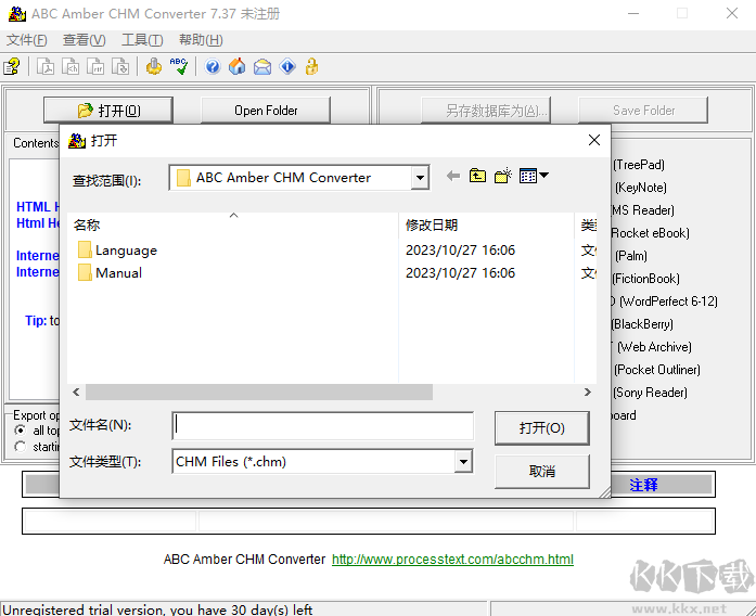 2、然后點擊打開按鈕。選擇一個需要轉(zhuǎn)換的CHM文檔。