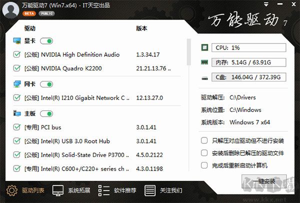 這是一個(gè)無需過多說明的環(huán)境,萬能驅(qū)動(dòng)7已經(jīng)被設(shè)計(jì)為一個(gè)按鈕解決驅(qū)動(dòng)問題。萬能驅(qū)動(dòng)7將自動(dòng)檢索所有硬件,并自動(dòng)給出最佳驅(qū)動(dòng)方案,只需要單擊“一鍵安裝”按鈕,稍事片刻后所有驅(qū)動(dòng)就會(huì)安裝完畢!
