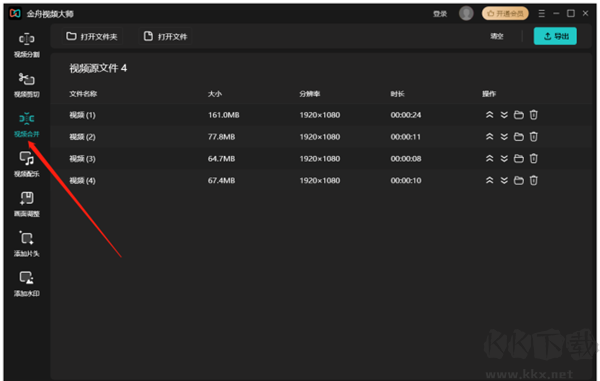 用戶可以添加多個不同格式的視頻進行合并,任意調(diào)整先后順序,一鍵合并導出。