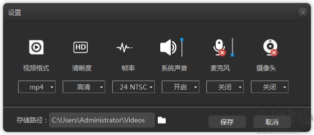 步驟三:在軟件主界面右邊點擊齒輪設(shè)置按鈕進(jìn)入視頻參數(shù)界面。對視頻格式、視頻清晰度、視頻幀率等基礎(chǔ)視頻參數(shù)進(jìn)行設(shè)置,設(shè)置出符合自己要求的視頻水準(zhǔn)。另外在這個界面上還可以選擇是否開啟系統(tǒng)聲音開關(guān)、麥克風(fēng)開關(guān)和攝像頭開關(guān),選擇視頻的存儲路徑。設(shè)置完畢后,記得檢查一般再進(jìn)行保存。