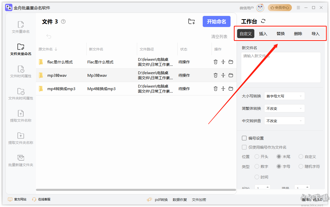 2、在右側(cè)工作臺中選擇命名方式:自定義、插入、替換、刪除、導入。