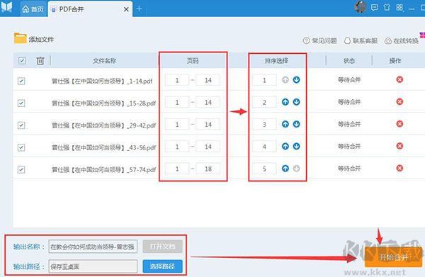 ③在PDF合并界面,已添加文件進(jìn)行合并,需注意合并的“頁(yè)碼”,選擇正確的合并頁(yè)數(shù),根據(jù)“排序選擇”選擇正確的排序文件順序,設(shè)置完畢可查看左下角的“輸出名稱”,給需要合并的文件起個(gè)大名,方便轉(zhuǎn)換成功后區(qū)別與其他多個(gè)文檔名稱。并選擇文件的“輸出路徑”,點(diǎn)右下方的“開(kāi)始合并”即可。文件會(huì)按照設(shè)置合并成一個(gè)文檔,合并的文檔是重新生成的,對(duì)原文檔無(wú)影響。