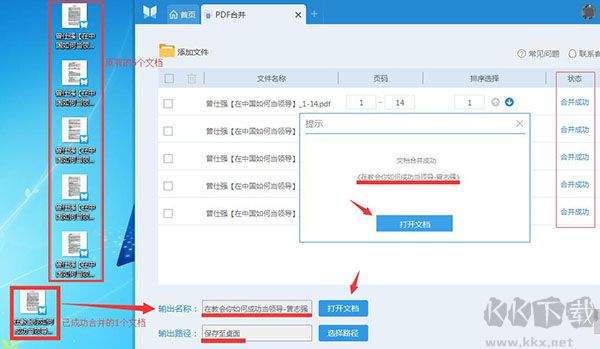 ④當(dāng)狀態(tài)欄顯示“合并成功”便可到所保存的路徑查看已合并的PDF文檔,根據(jù)輸出路徑查看桌面上已成功合并了1個(gè)文檔,需注意是如已修改過(guò)的文檔名稱才是成功合并的那一個(gè)文檔哦。
