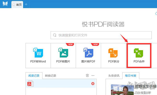 ①首先下載安裝最新版本“悅書(shū)PDF閱讀器”并打開(kāi)軟件,即可看到首頁(yè)一欄“PDF合并”功能,單擊打開(kāi)即可。