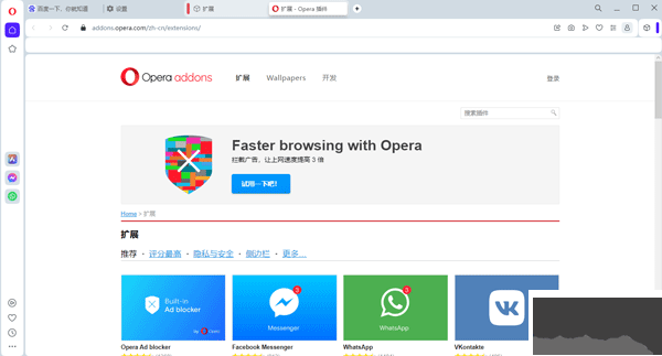3、更具個(gè)性的瀏覽器,Opera 瀏覽器擁有1000多個(gè)擴(kuò)展,您可以根據(jù)自己的習(xí)慣輕松自定義。在 Opera 插件目錄頁(yè)面中,各種擴(kuò)展和主題任您挑選,讓您隨心所欲地增加個(gè)人特色并獲取最佳瀏覽體驗(yàn),在這里一切由你做主,你的地盤(pán)除了你無(wú)人能控制哦。