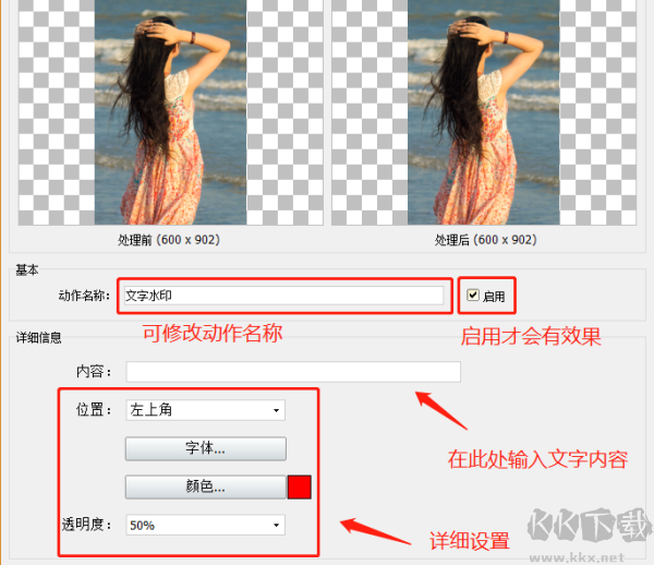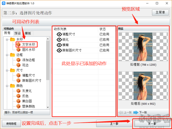 圖片處理動(dòng)作包括水印添加、邊框添加、尺寸修改、顏色修改。