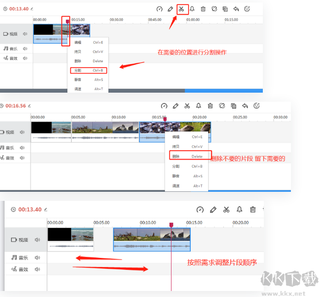 A:除了上面拖拽兩端起止點(diǎn)的操作,還可以通過使用小剪刀(分割)對視頻進(jìn)行分割,之后對不需要的片段進(jìn)行刪除操作,時間軸上按照時間順序留下您要的片段即可。此處以專業(yè)模式為例,快速模式是類似的操作哦~