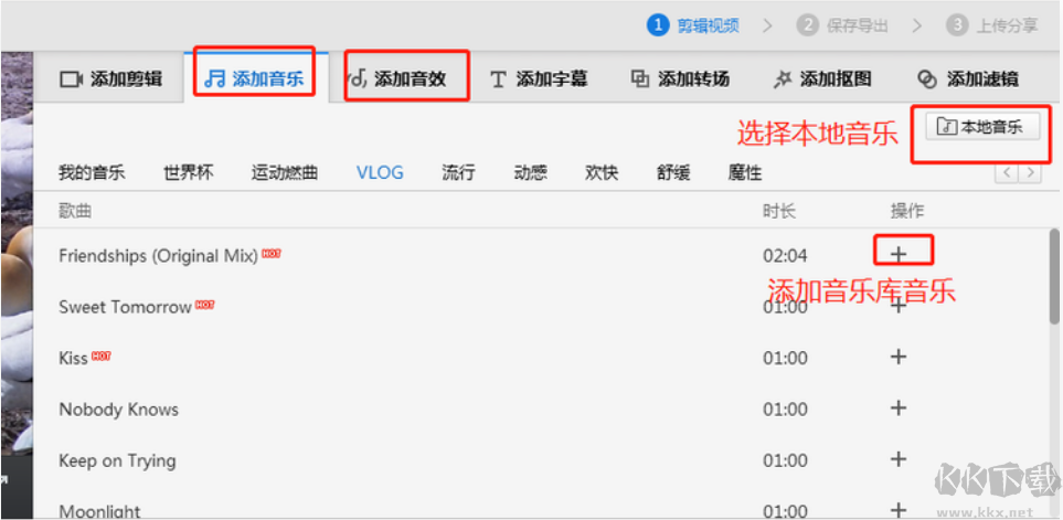 A:您可以從音樂庫/音效庫添加音樂,也可以添加本地音頻,以下分別是專業(yè)模式和快速模式音頻添加方法