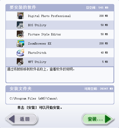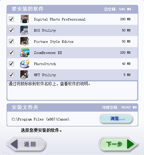2.默認安裝路徑:C: \Program Files (x86) \Canon\;選擇要安裝的軟件,點擊瀏覽選擇安裝位置