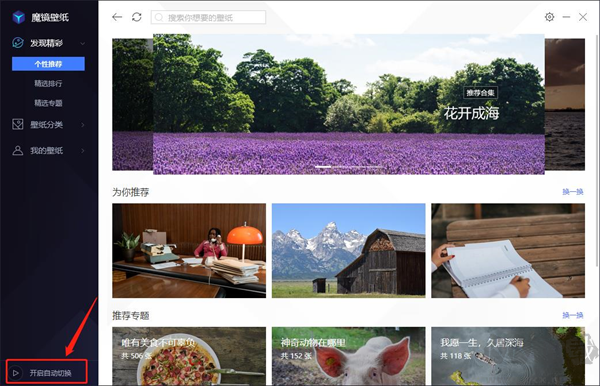1、點擊魔鏡壁紙首頁界面的右側(cè)底部的【開啟自動切換】功能。